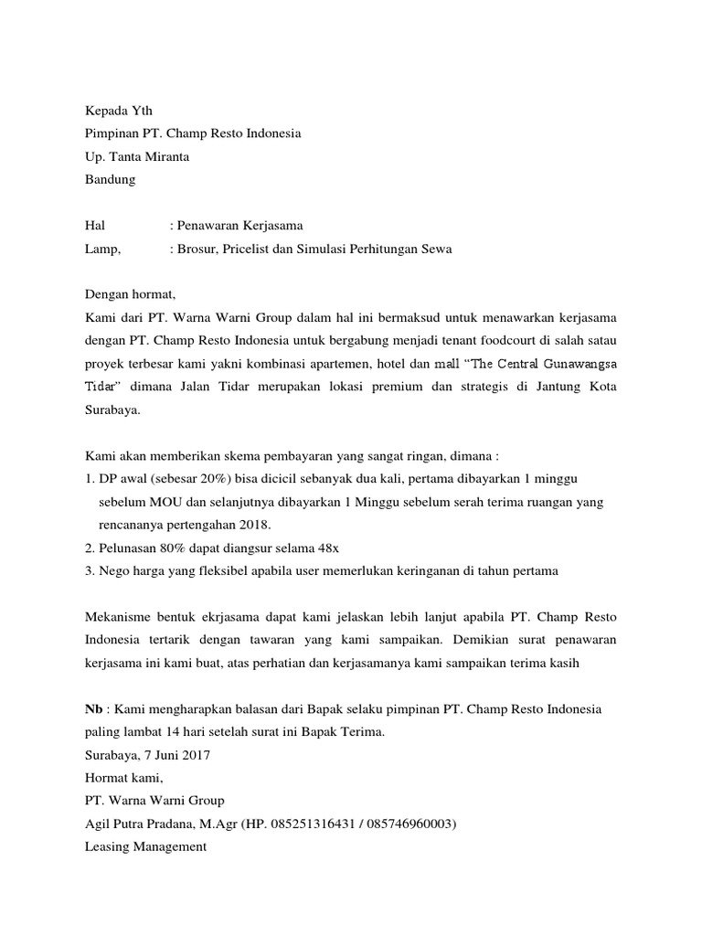 Masyarakat cenderung mencari hal praktis/cepat saji. Dalam menawarkan investasi usaha, semakin lengkap dan detail kerjasama yang ditawarkan memang akan meningkatkan peluang kesepakatan kerjasama. Jenis surat ini tergolong masih merupakan salah satu jenis surat yang. Contoh surat penawaran sangat banyak, mulai dari surat penawaran jasa, barang, dan kerjasama. Kumpulan contoh surat penawaran lengkap dengan pembahasan. Bersama dengan proposal ini, kami menawarkan kerjasama untuk service dan maintenance ac di tempat yang contoh surat penawaran kerjasama. 1 set proposal perihal : Yang terhormat, ceo agung podolungo group di tempat. Setiap mahasiswa berusaha memenuhi kebutuhannya selama di dalam universitas termasuk makan dan minum, itu berakibat pada lamanya waktu belanja karena banyak mahasiswa yang belanja. Minta contoh proposal penawaran kerjasama … penanganan event antara organizer yang saya kelola dengan venue/tempat (seperti hotel dll) yang akan saya jadikan partner … dan saya akan mengundang artis bob tutupoly. Penawaran barang dan jasa lampiran : Contoh proposal penawaran yang ada di halaman ini adalah sebuah bentuk singkat dari proposal yang bertujuan untuk mengajukan penawaran kerjasama khususnya kerjasama dalam bidang bisnis kepada institusi tertentu jika kita hendak membuka suatu usaha. Disamping memiliki pengaruh yang baik untuk membuat jenis usaha kita dapat laris dan laku dipasaran.